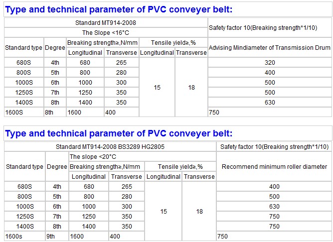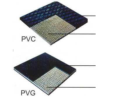 PVC type conveyer belt's upper and lower layers are PVC coating cover, single-sided tape thickness: ≥1.0mm; PVG type belt's upper and lower layers are nitrile rubber and PVC, single-sided tape thickness: 1.5mm-4.5mm.